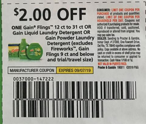 $2 OFF/1 GAIN FLINGS OR GAIN POWDER OR GAIN LIQUID DETERGENT EXP 9/7/19